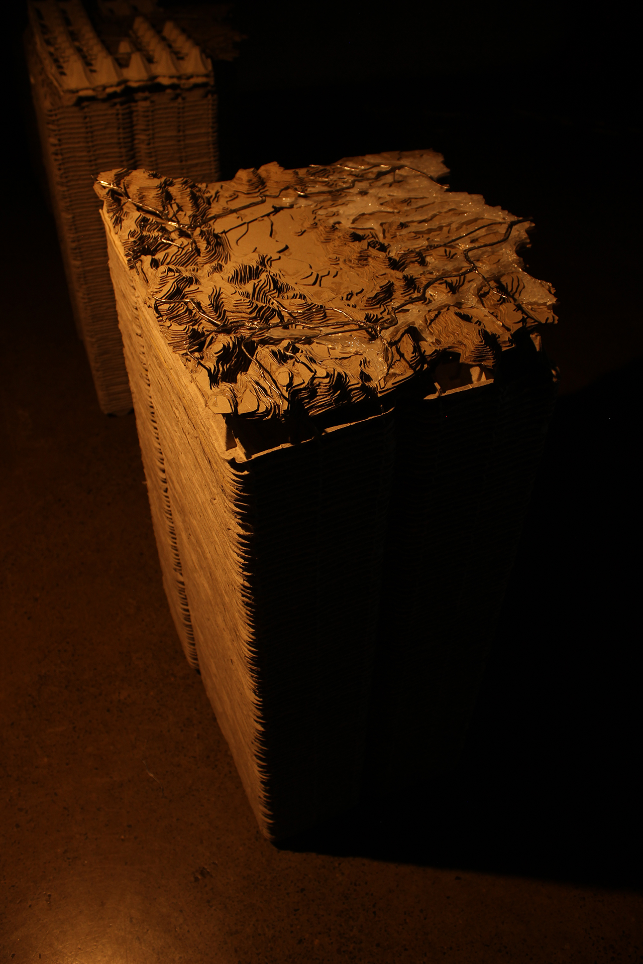 ‘La disposición de maquetas de cartón hechas en bandejas para huevos remite a una serie de paisajes en miniatura que reproducen las distintas cotas topográficas de un lugar y sus conexiones electrificadas. Esas bandejas son, en la vida diaria, un material ya reutilizado que se ha vuelto inerte: ni siquiera son aceptadas para su reciclaje. De igual forma, el símil se extiende para las capas de tierra que la industria contaminante del sector parece tornar en un material desnaturalizado, yermo. Tierra muerta.’ Pedro Donoso