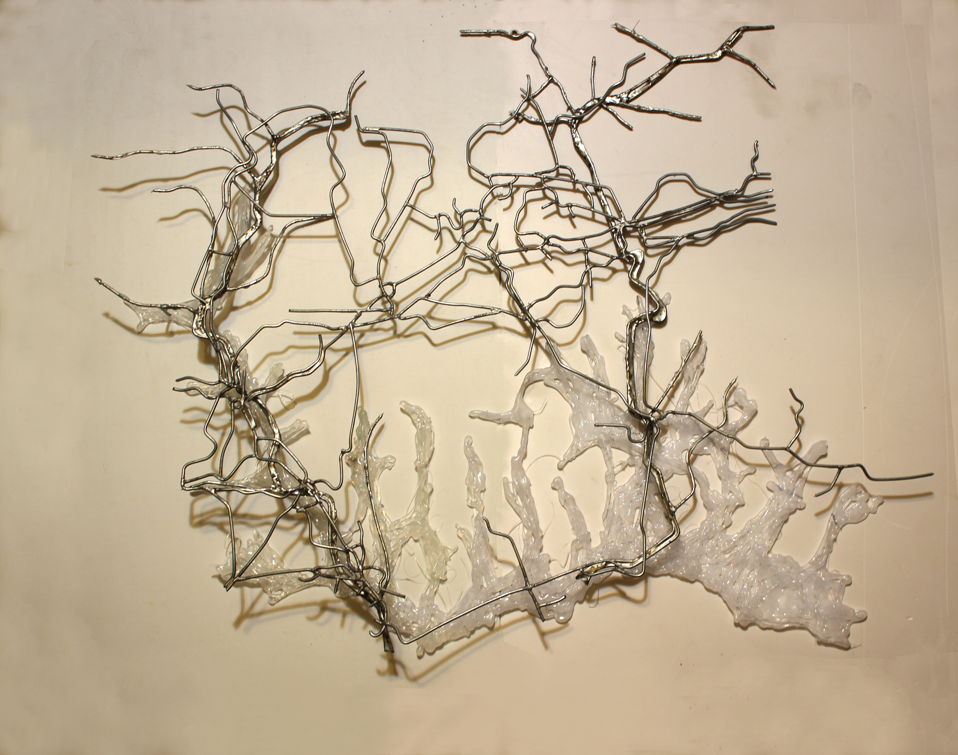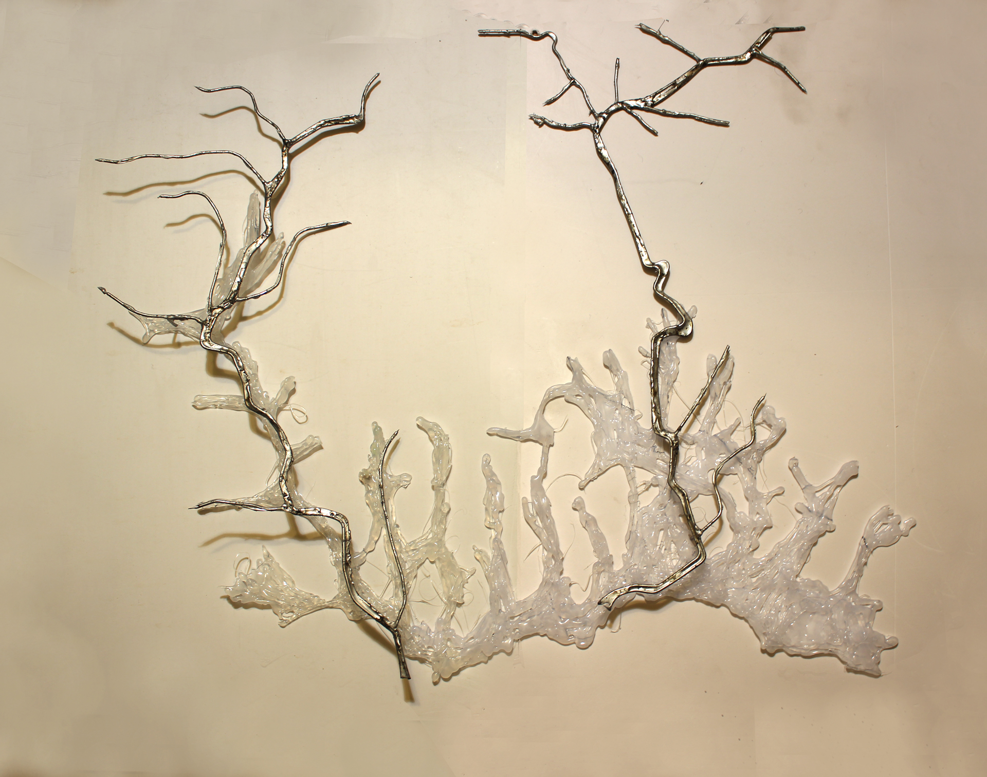 Con la debida sutileza, Elisa Balmaceda y Cristián Espinoza reúnen una pequeña colección de especies y materiales para formar un archipiélago de situaciones dentro de la sala. En lugar de recurrir a los datos, las imágenes o las amenazas veladas, solo nos enfrentan con los restos de nuestros ejercicios industriales de subsistencia. La vida en el planeta humano no es posible sin las torres de alta tensión, sin la electricidad que nos rodea, sin una serie de ondas que viajan por el aire. Nuestra condición electromagnética es, por otra parte, la base de nuestros procesos sociales más básicos -desde mantener los alimentos a contar con la corriente para poder leer este artículo alojado en una publicación electrónica. La pregunta planteada por Elisa y Cristián en su trabajo es, entonces, más profunda y radical y llega a las raíces de aquella industria que nos sostiene de manera invisible. El signo de identidad de nuestra especie es la transformación de las conexiones materiales que crean una gran acumulación de mutaciones, paradojas, anomalías y problemas.